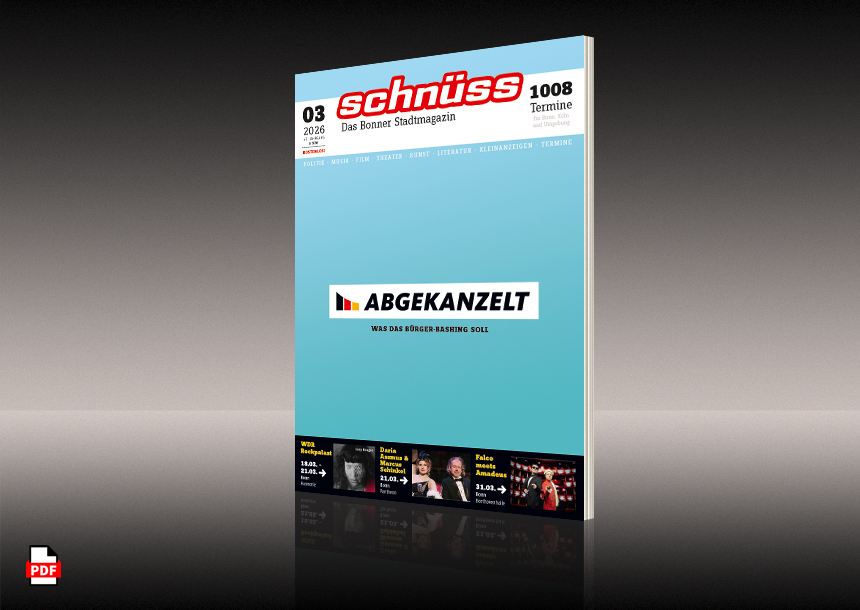 | Musik Kunst Film Theater Kultur und Politik: Was ist los in Bonn? Das Stadtkulturmagazin Schnüss gibt Ihnen den aktuellen Überblick mit umfangreichem Veranstaltungskalender und aufschlussreichen Einblicken ins Bonner Geschehen. Jeden Monat gratis. In Bonn, für Bonn. |